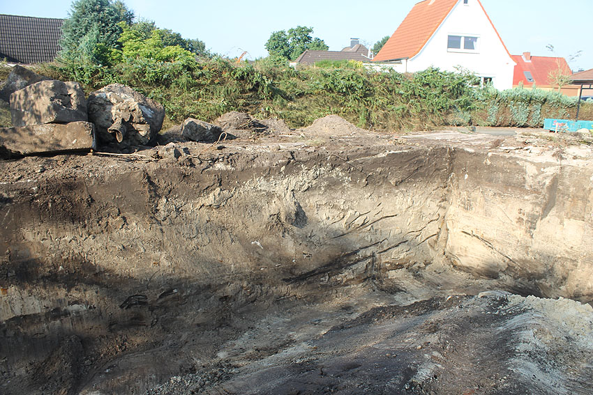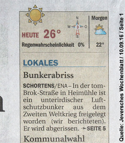 Am 7. und 8. September 2016 wurde nun der betonierte Deckungsgraben an der tom-Brok-Straße Ecke Bahnhofstraße in Schortens / Heidmühle abgerissen. Das Bauwerk konnte beim besten Willen nicht in das geplante Neubauvorhaben (Einfamilienwohnhaus) integriert werden und musste deshalb leider weichen. Der Abbruch erfolgte durch die Firma Swyter GmbH aus Jever. Wir hatten die Gelegenheit, den Abbruch ausführlich zu dokumentieren. Unser herzlicher Dank an den Eigentümer des Grundstückes, Herrn Bruns, für die Ermöglichung!