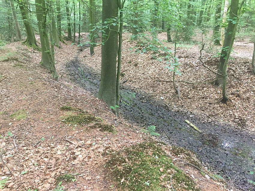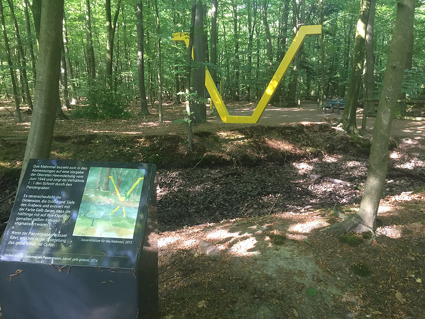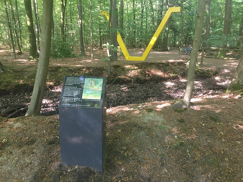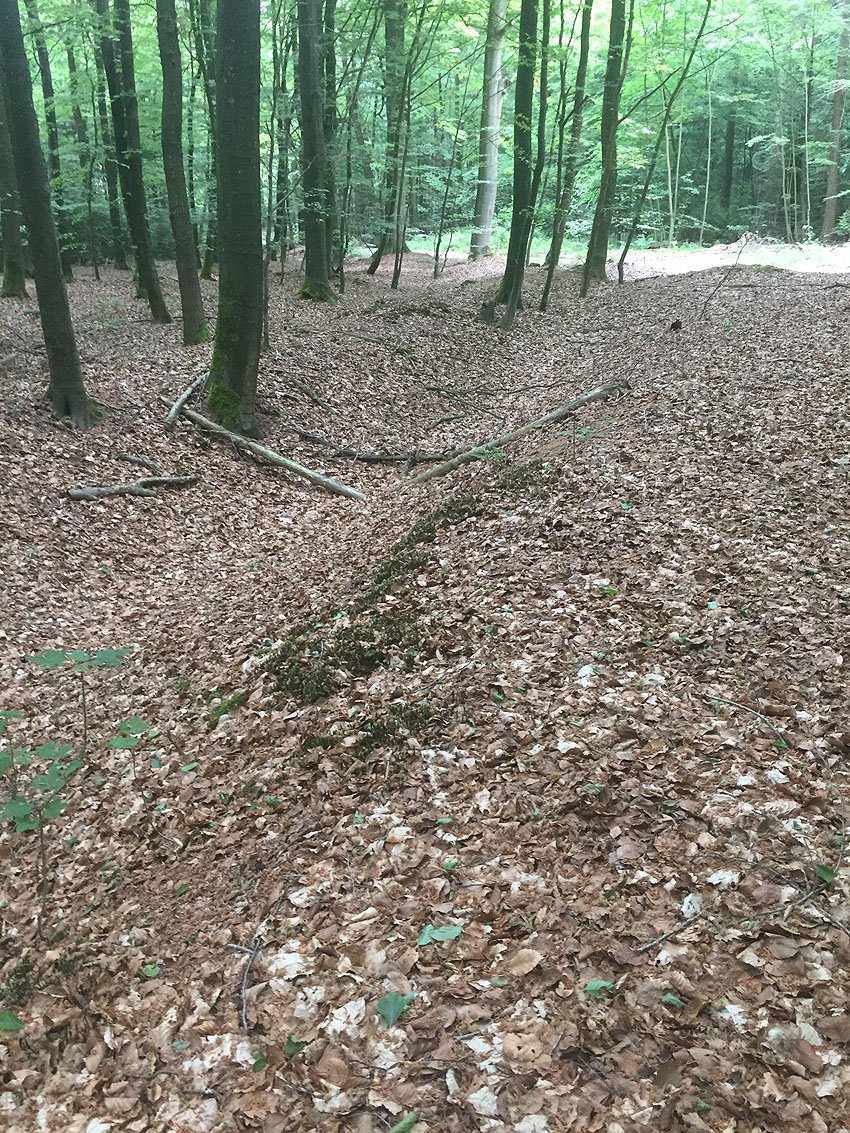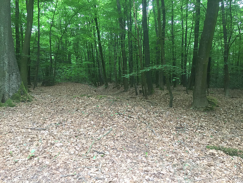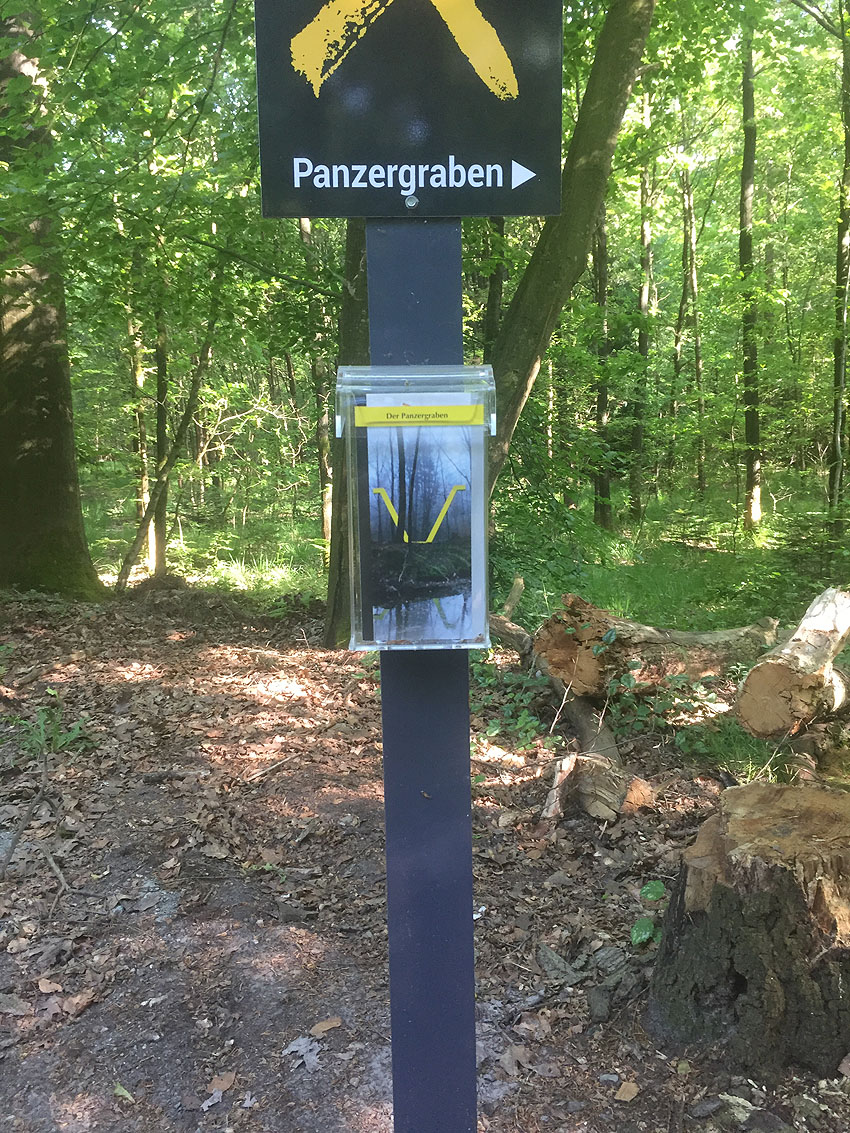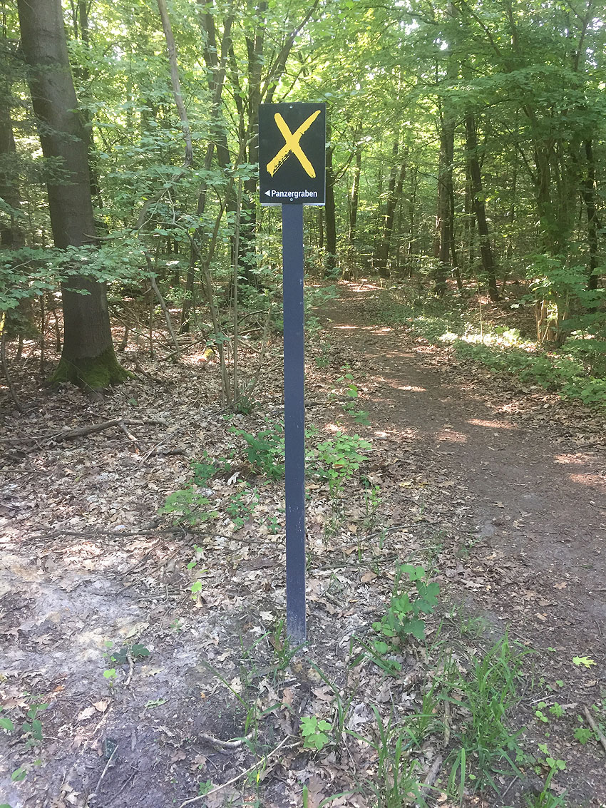 Die letzten Panzergrabenreste mit Gedenkstätte im Sandhorster Wald einige hundert Meter westlich der Bunker. Aufnahmen vom 26. Mai und 9. Juni 2023: