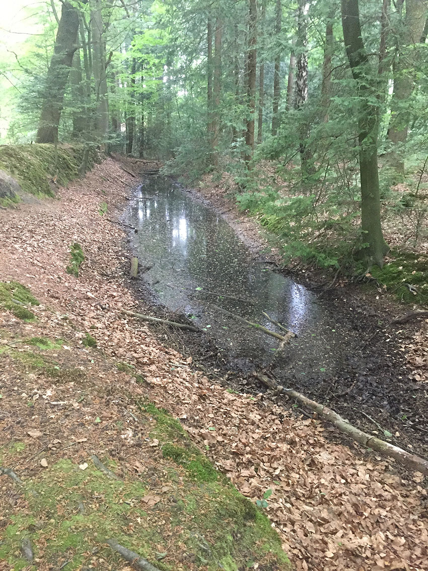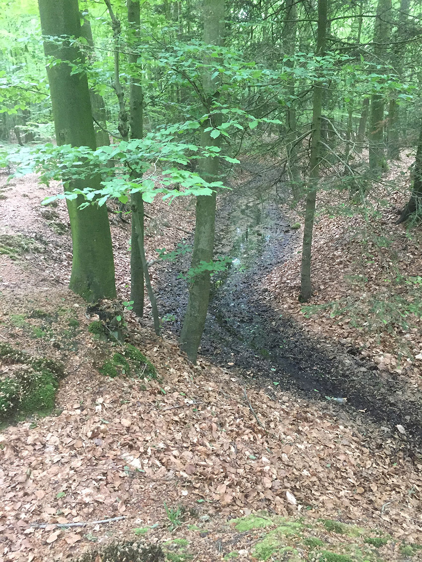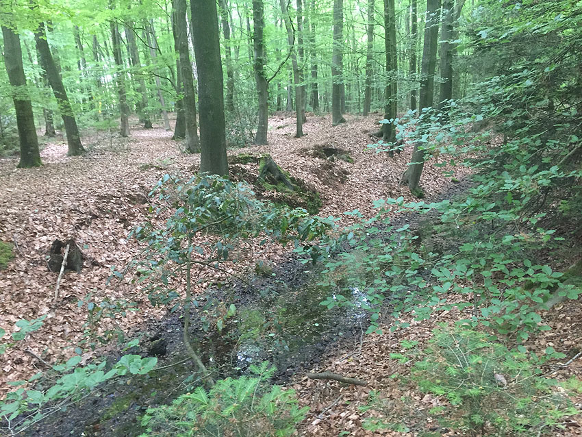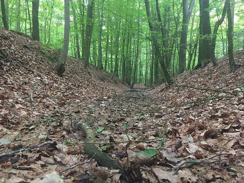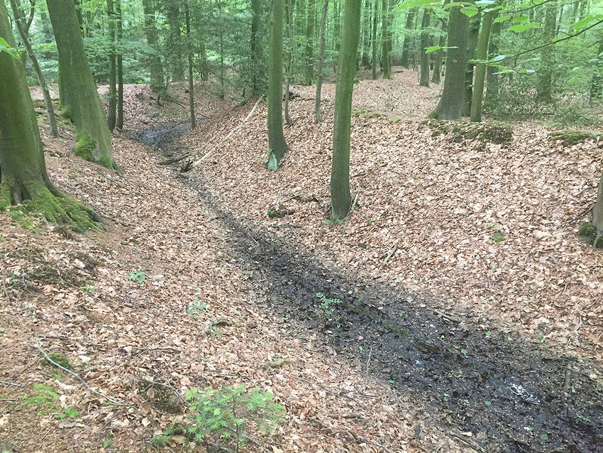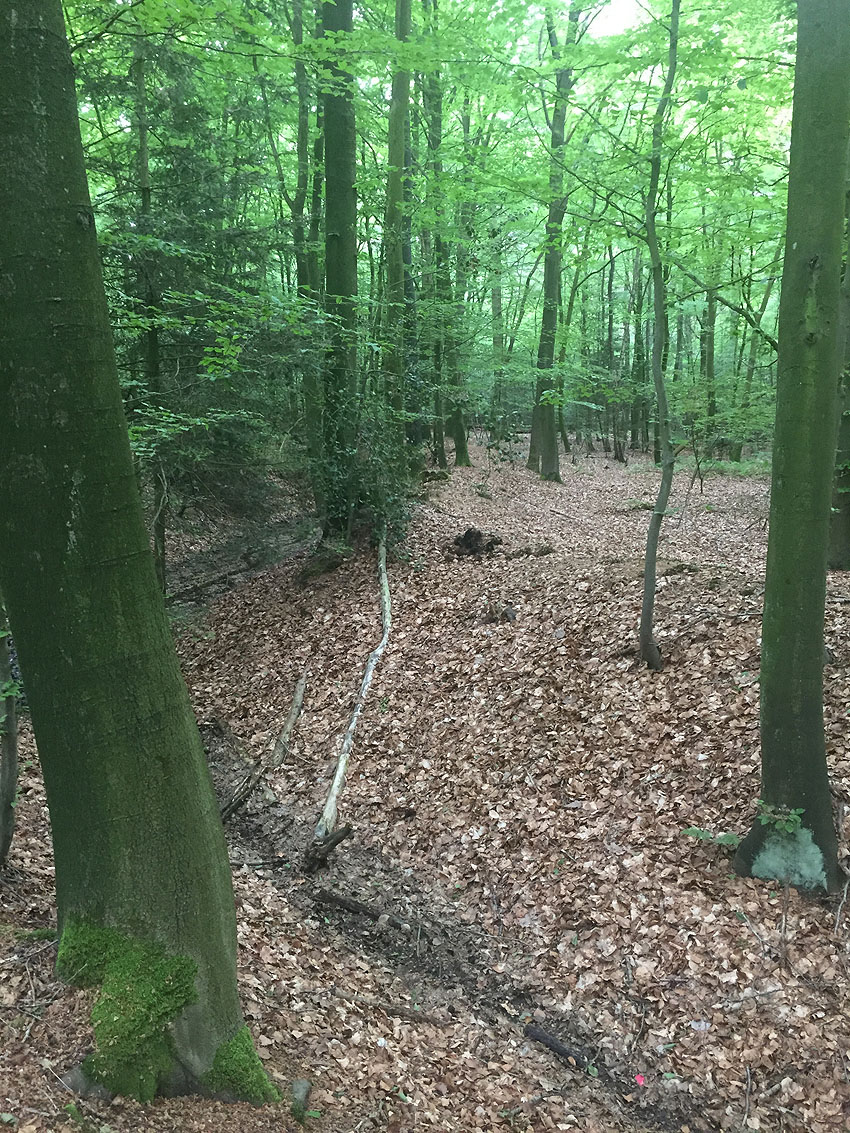 Die letzten Panzergrabenreste mit Gedenkstätte im Sandhorster Wald einige hundert Meter westlich der Bunker. Aufnahmen vom 26. Mai und 9. Juni 2023: