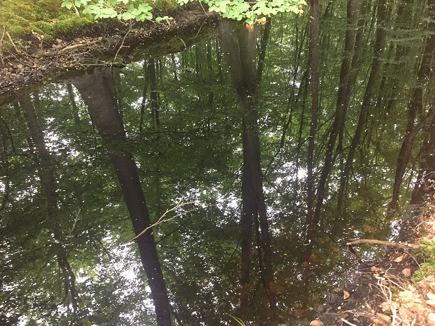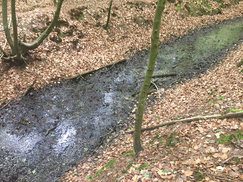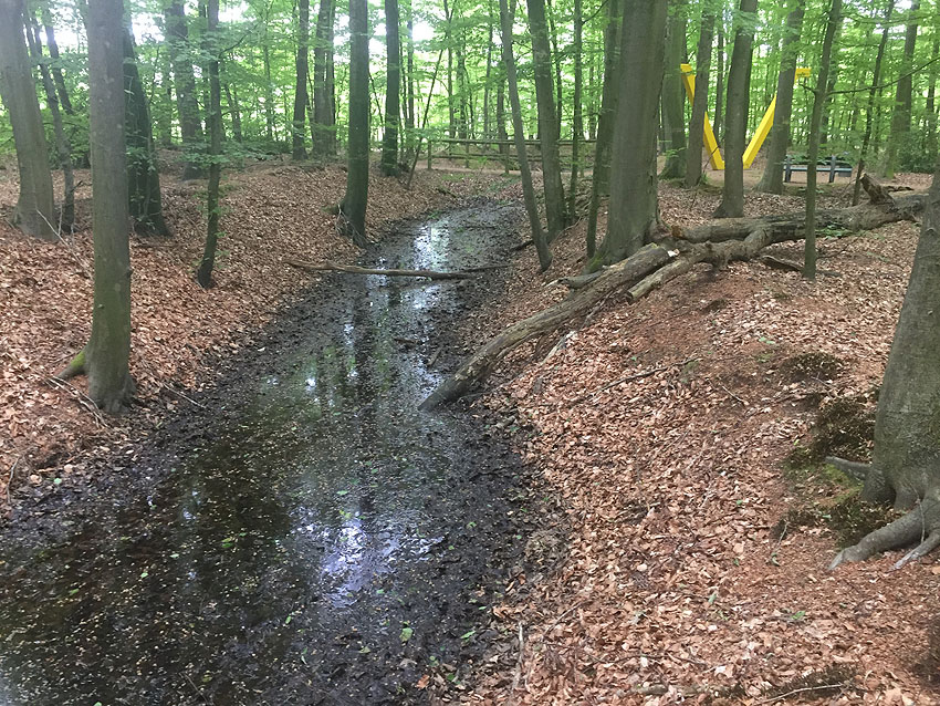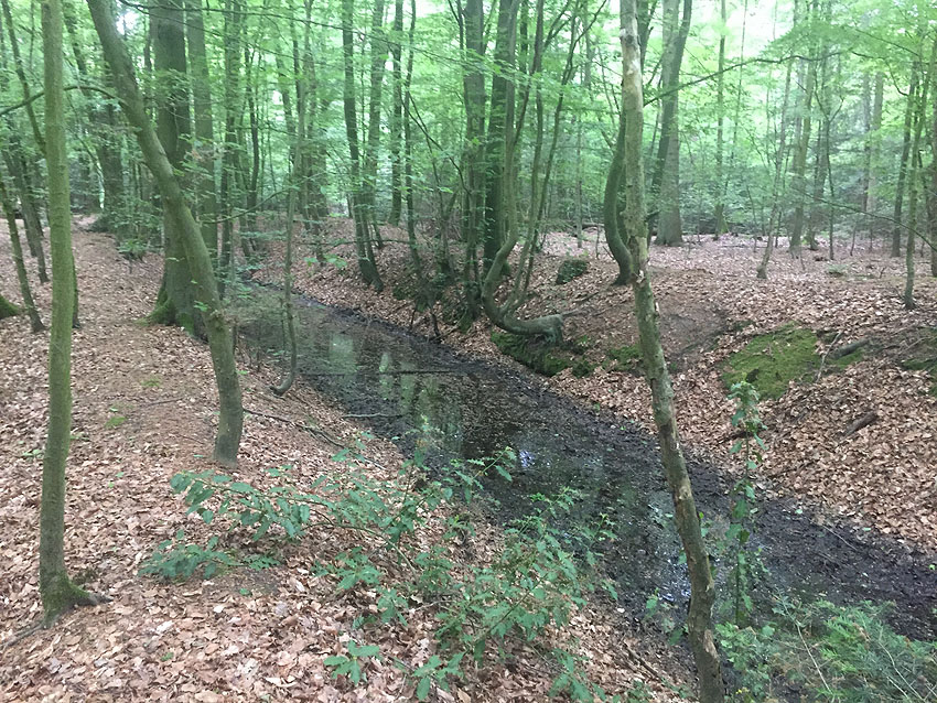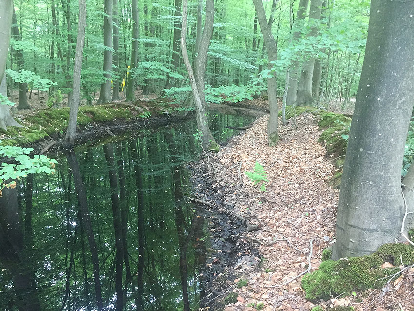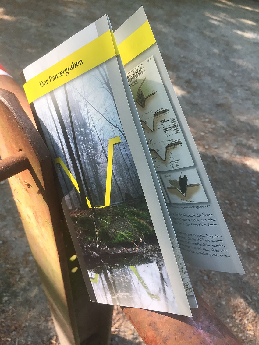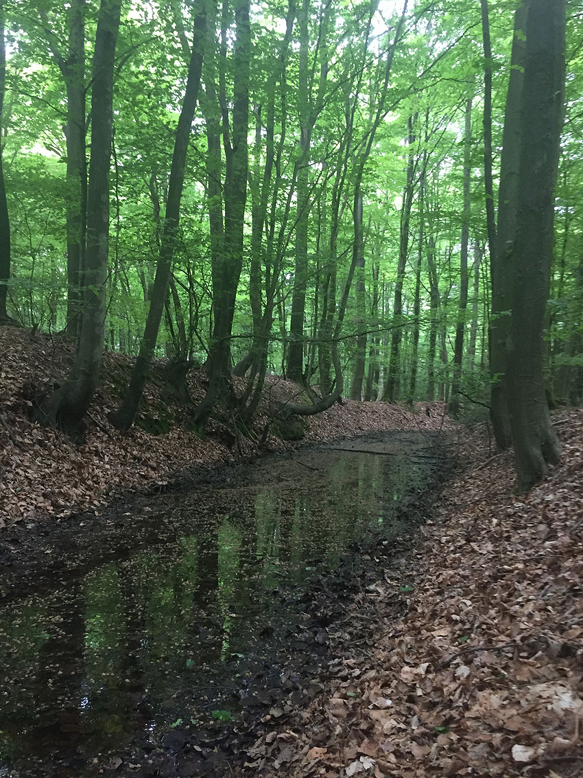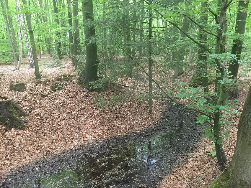 Die letzten Panzergrabenreste mit Gedenkstätte im Sandhorster Wald einige hundert Meter westlich der Bunker. Aufnahmen vom 26. Mai und 9. Juni 2023: