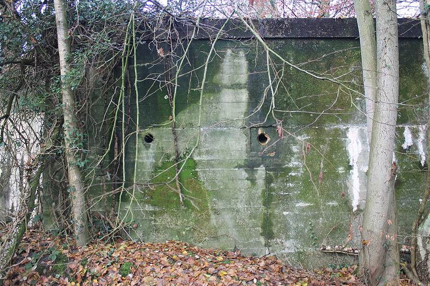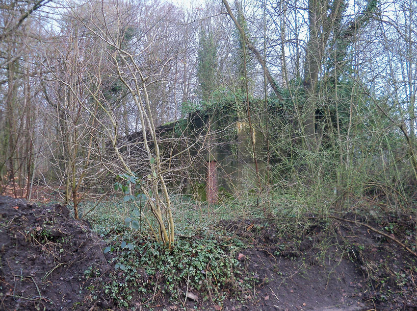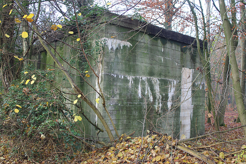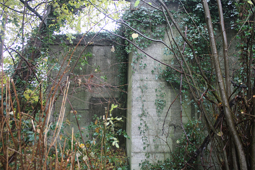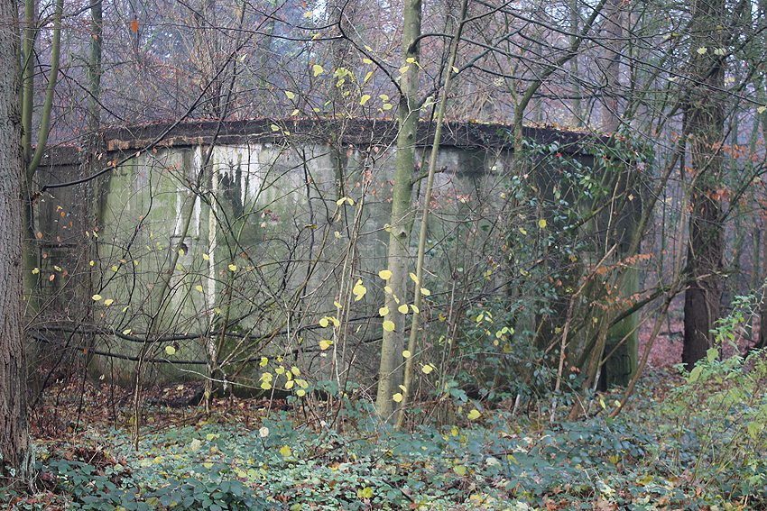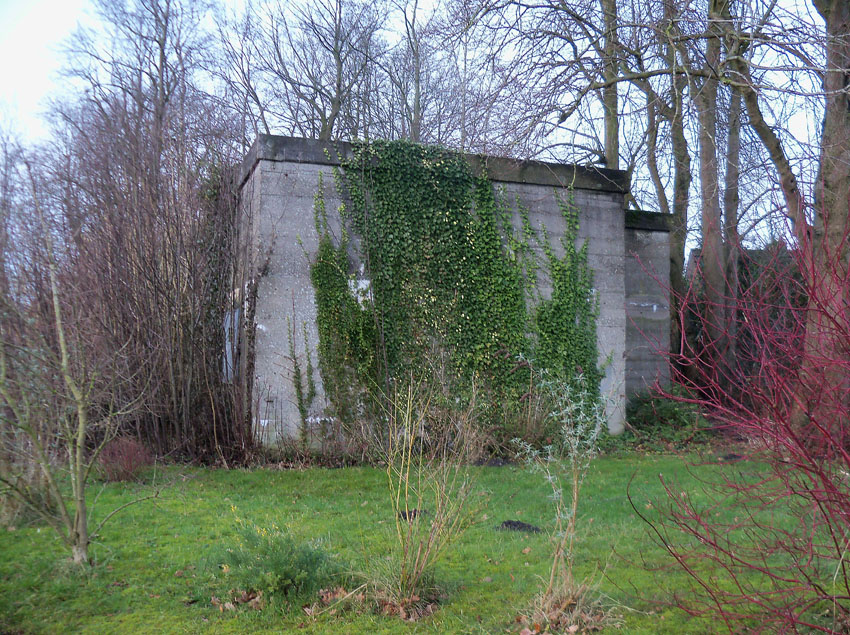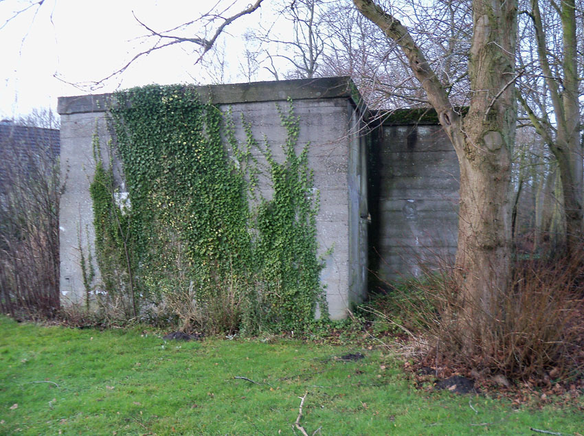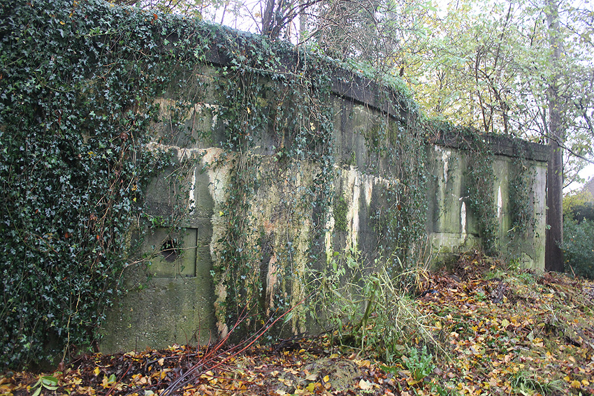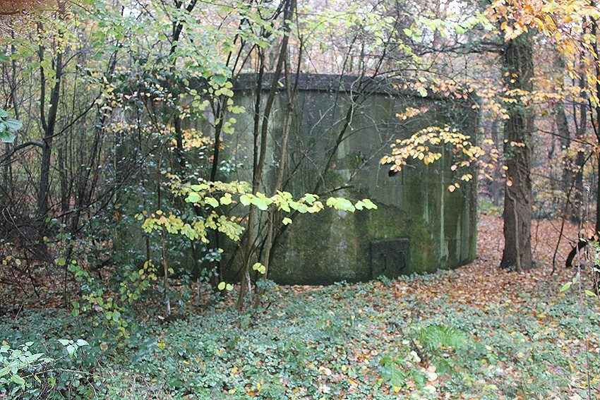Ein rechteckiger, wohl bombensicherer Bunker (Kleinbunker) mit vier Eingängen (fast alle komplett zugemauert)...