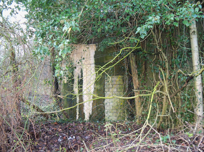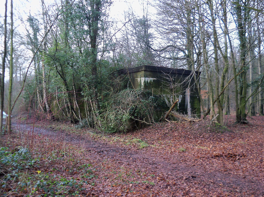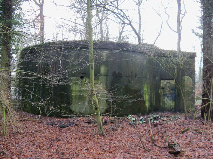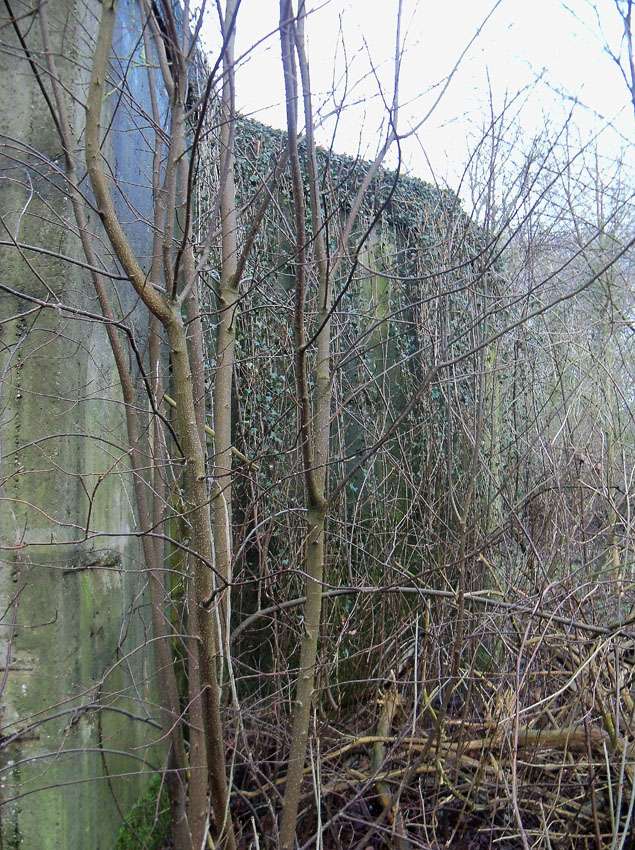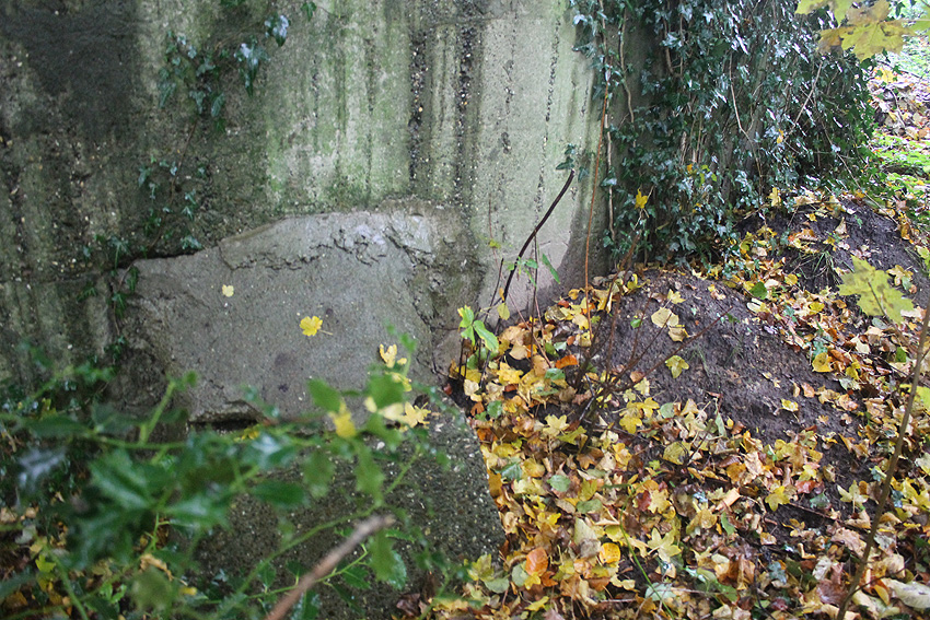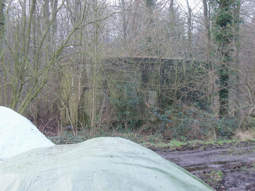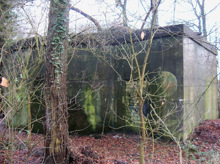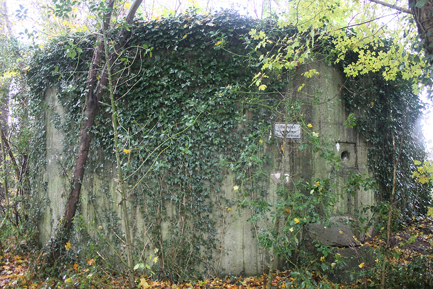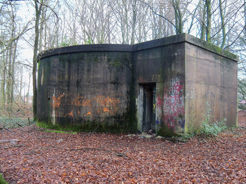 Ein rechteckiger, wohl bombensicherer Bunker (Kleinbunker) mit vier Eingängen (fast alle komplett zugemauert)...