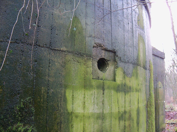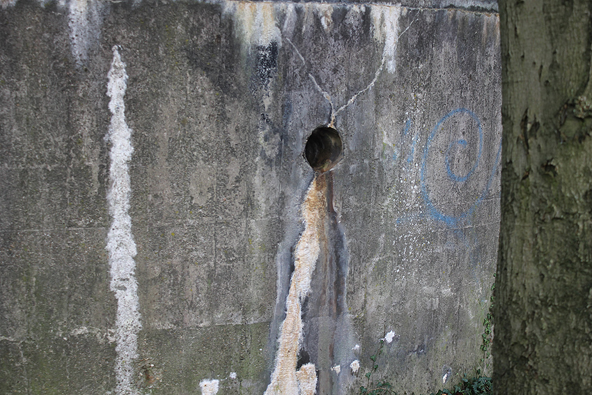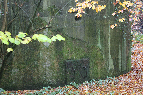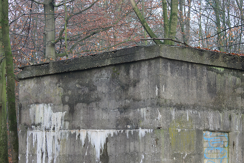 Am hier nicht ersichtlichen rückwärtigen Bereich des Westsplitterschutzvorbaues befindet sich ein heller Kreis, war hier ein ROTES KREUZ (wie am westlichen Rundbunker - Bilder folgend) angemalt?