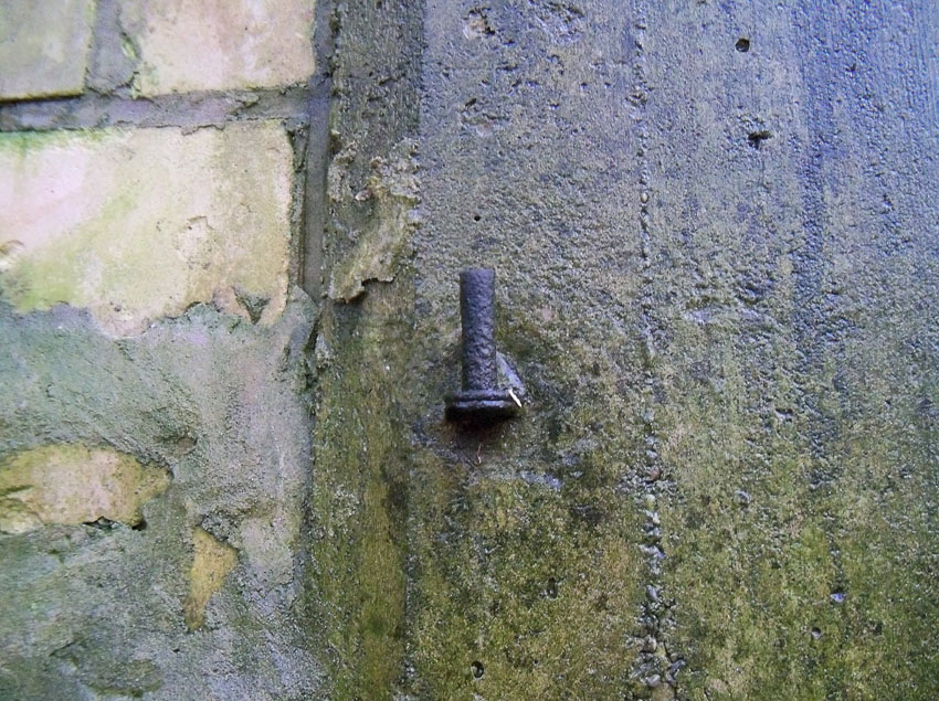 Neben dem Bauwerk befindet sich der herausgehebelte Notausstiegsbetonblock querliegend auf dem Erdreich. An der Außenwand erkennbar ist der Schiftzug: