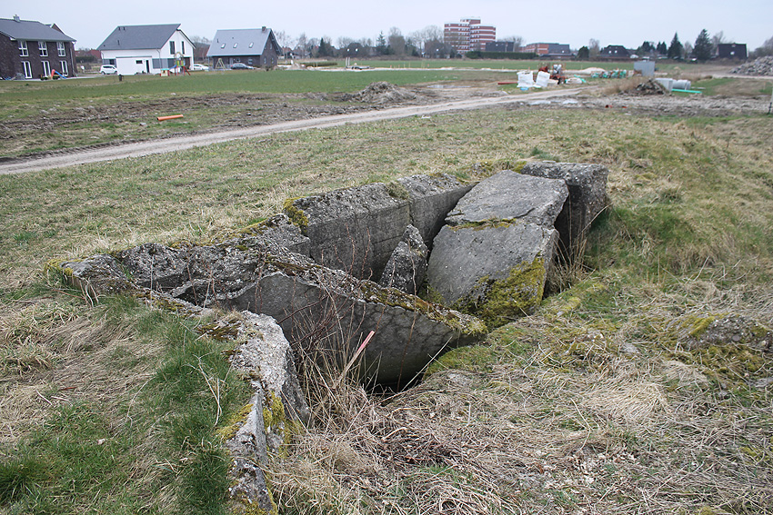 - Nachtrag 06.03.15: Die Ruinen der Flakstellung sind Anfang 2015 - genauer im Februar - abgerissen worden. Hier entsteht ein Neubaugebiet. Die Stellung war bis in die heutige Zeit noch gut erkennbar gewesen. Bis auf den nördlichen externen Munitionsbunker wurden sämtliche Relikte planiert. Ein weiteres Zeitzeugnis der Regionalgeschichte ist damit Vergangenheit. -