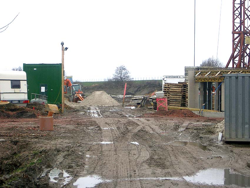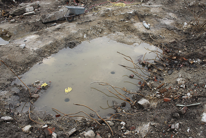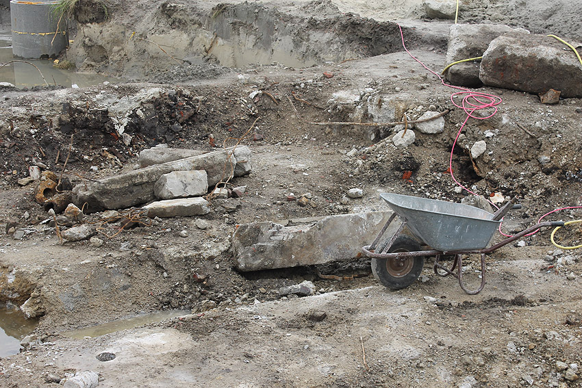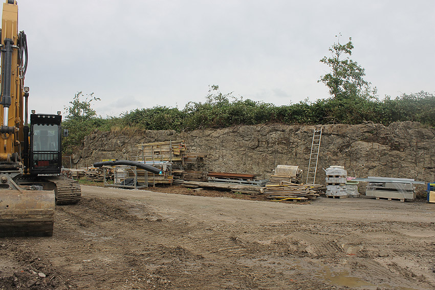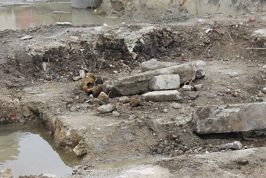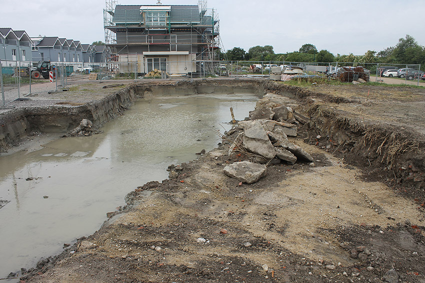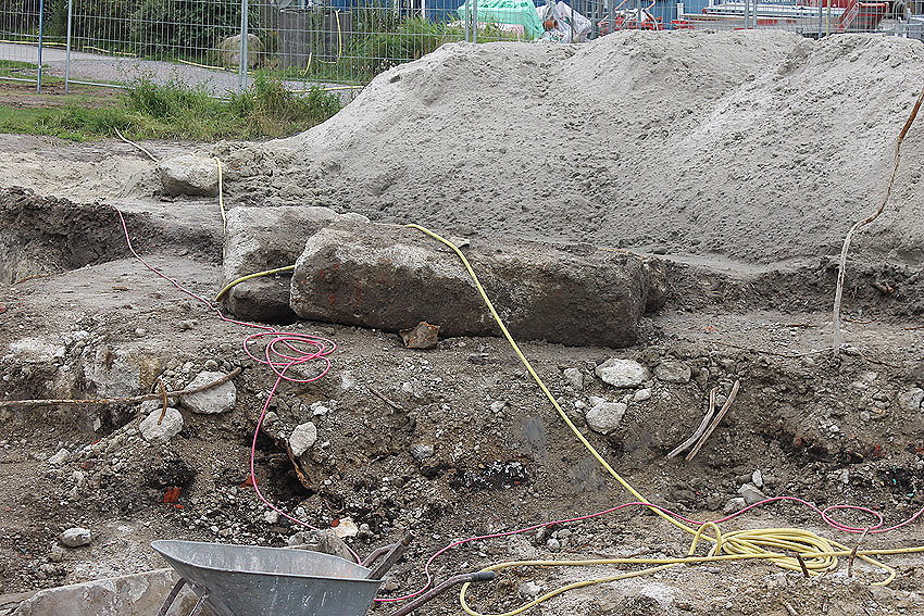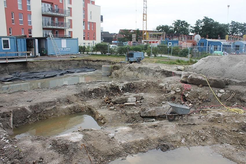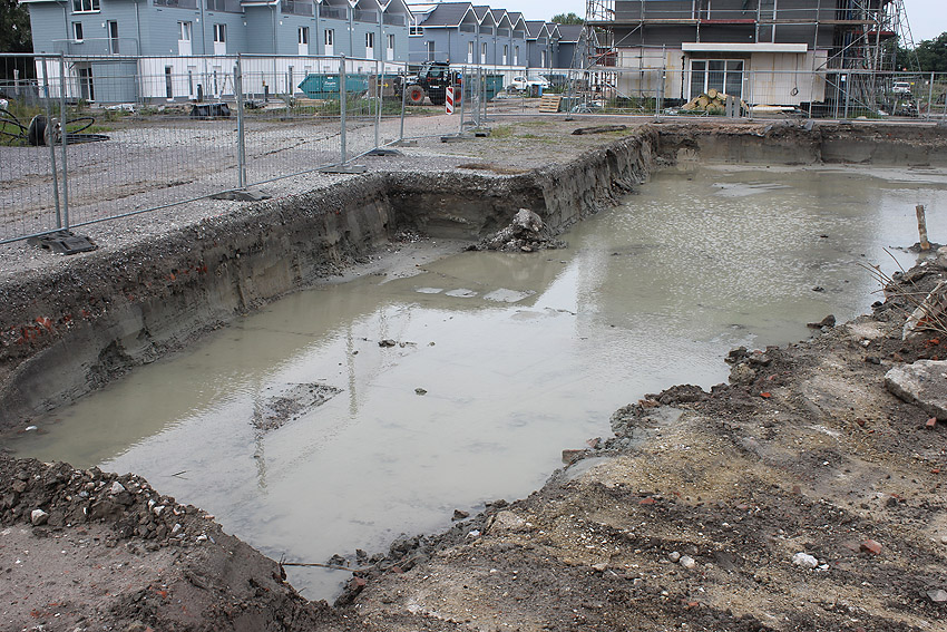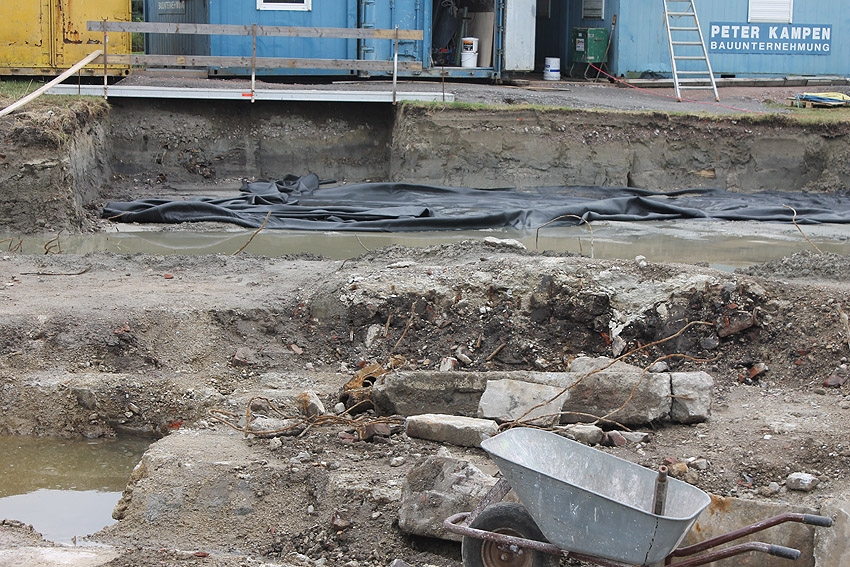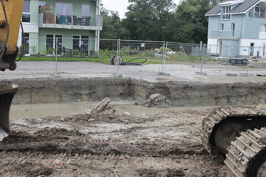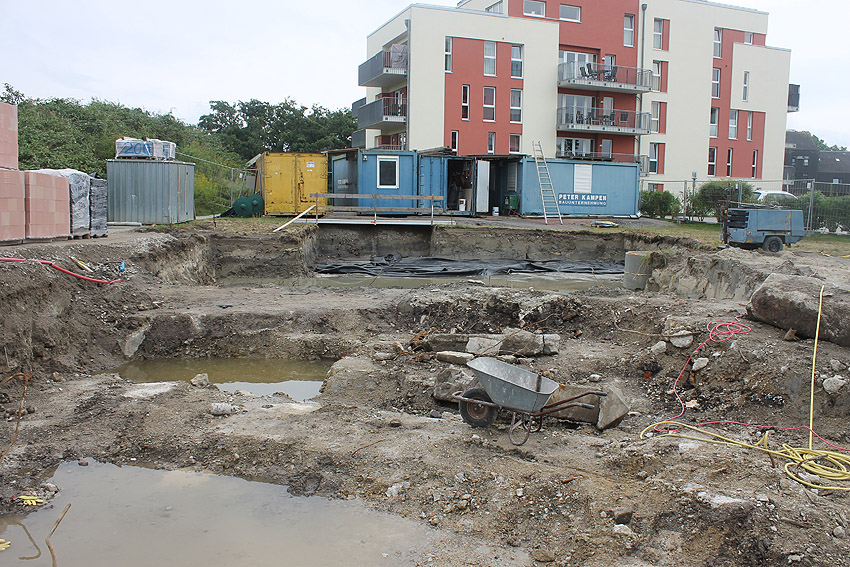 Die Betonstrukturen im Baustellenbereich sind größtenteils beseitigt worden. Weitere Strukturen als die ersichtlichen sind nicht mehr ans Tageslicht getreten. Nun erfolgt die Tiefgründung des Neubaues.