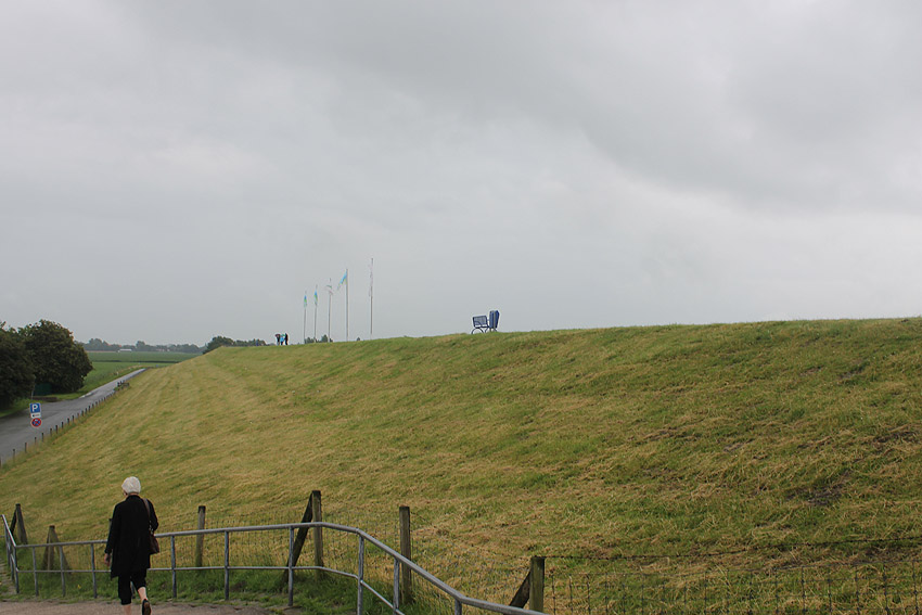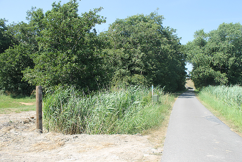 Oben: Hier auf dem Deich befand sich Scheinwerferstand 17 / Peters-Denkmal.