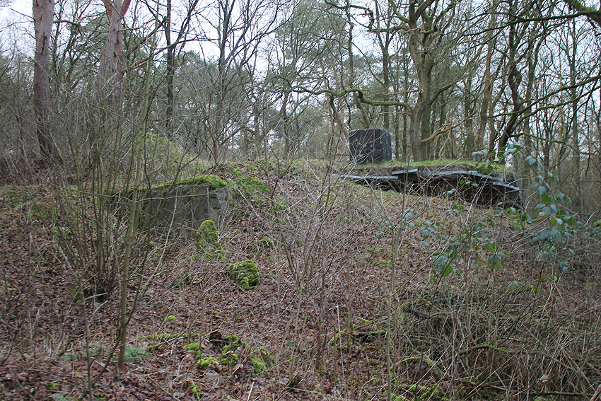 Decke und Wände großteilig zerstört / Trümmer großteilig beseitigt / augenscheinlich nur Eingangswände links und rechts teilweise erhalten / augenscheinlich Rest zumindest eines Lüftungsschornsteines erhalten / Erdum- überböschung in Ansätzen erhalten