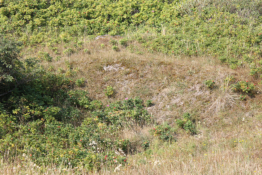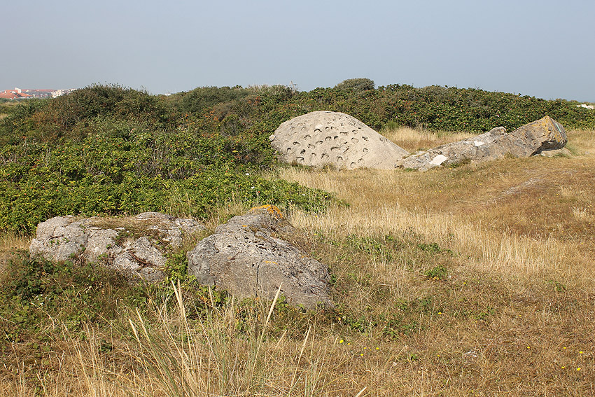 Es wäre aber allerdings auch möglich, dass der Bunkerrest in den Bildern oben durchaus die Schartenbunker-Umbauung eines der Geschütze mit Fertigung 1944 darstellt. Auf vorliegendem Fotomaterial ist ein Geschützbunker mit gleichen Vertiefungen und gleicher Rundkrümmung im Deckenbereich zu sehen...