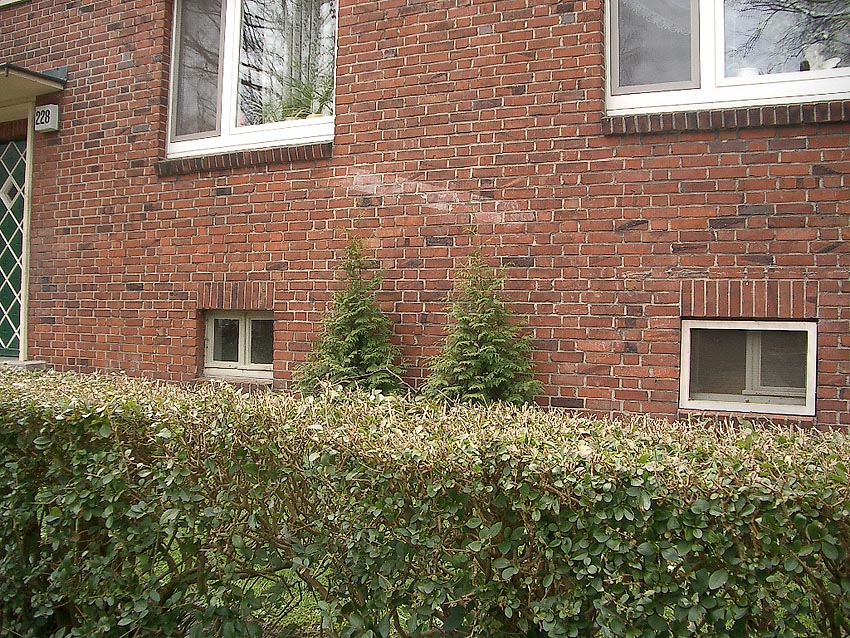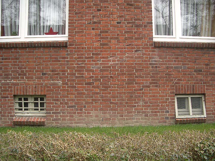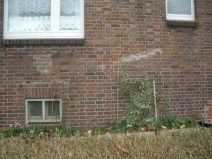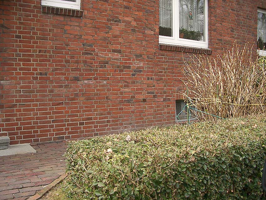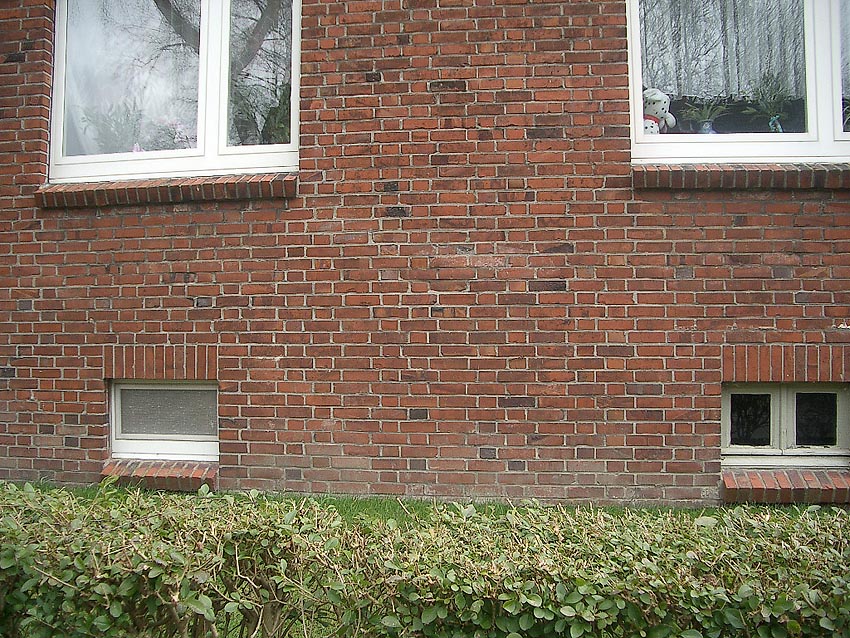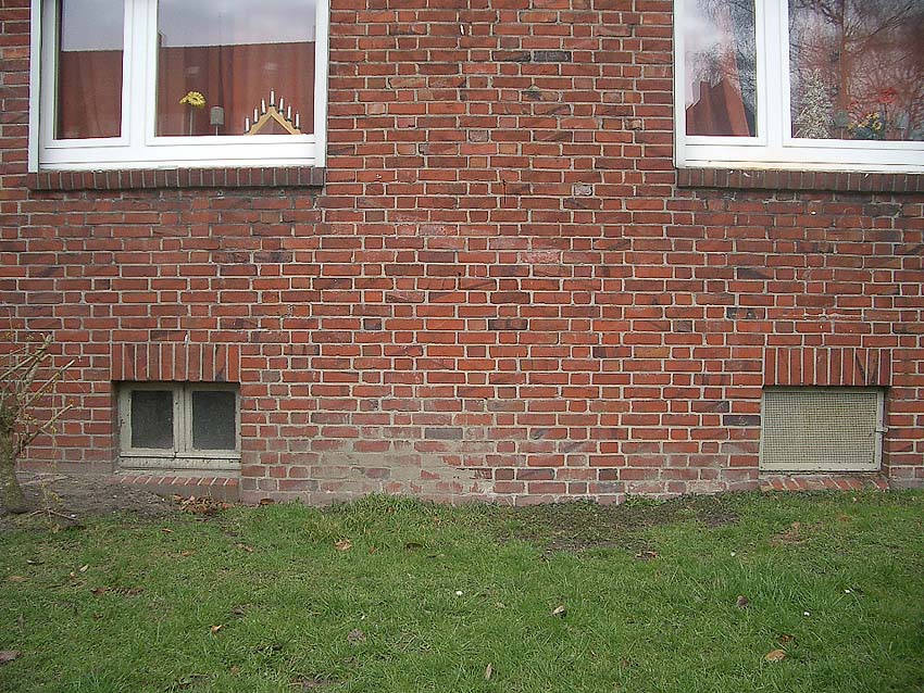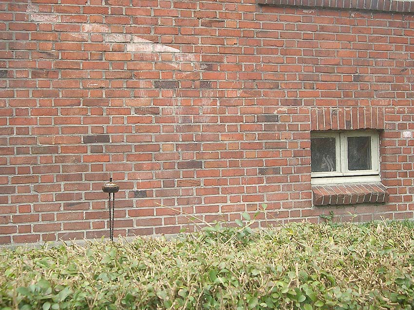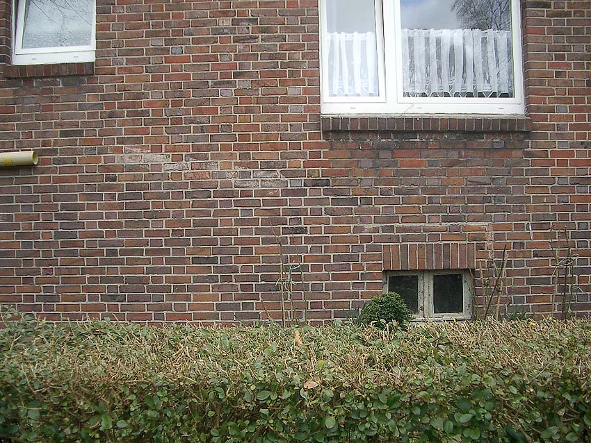 Auch vor den nachfolgend abgebildeten ehemaligen LS-Kellerfenstern waren wie vor diversen anderen Kellerfenstern im Stadtgebiet Betonblöcke gelagert worden. Sie sollten Schutz vor Detonationsdruck bieten. Auch auf den nachfolgenden Bildern sind Reste der Putzfugendichtung teilweise noch gut zu erkennen...