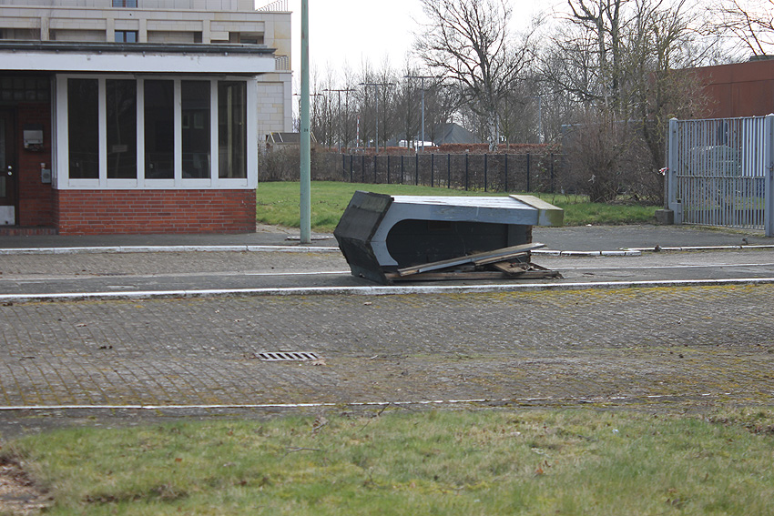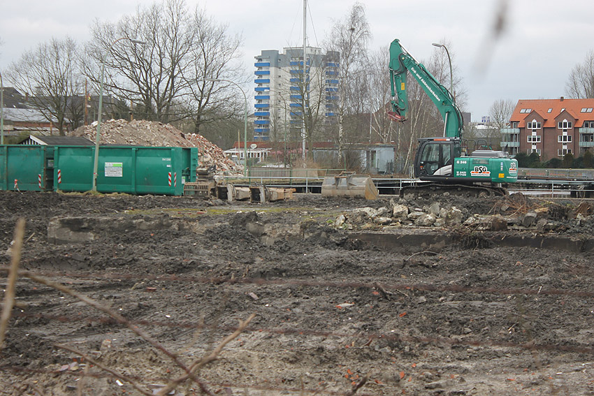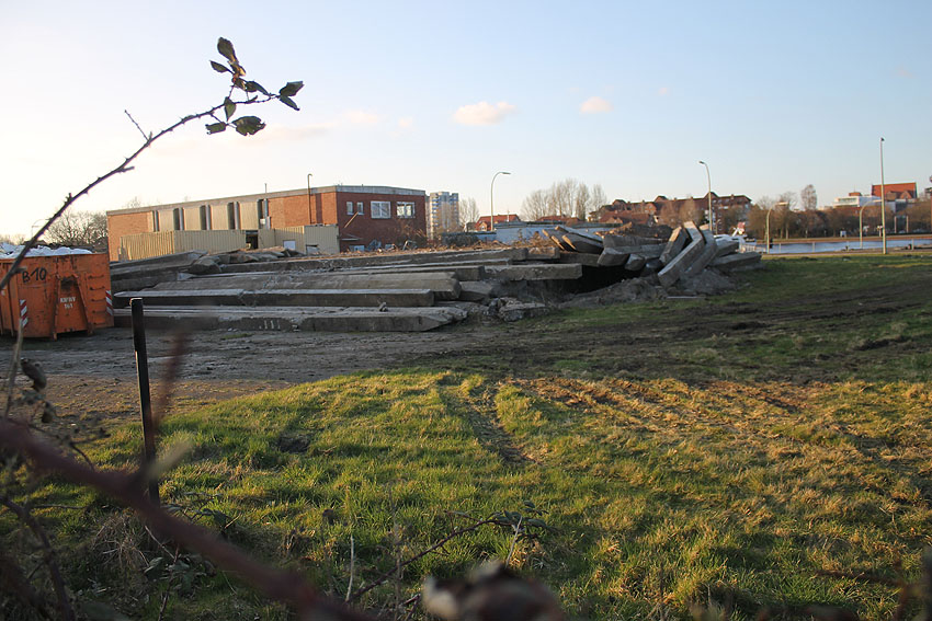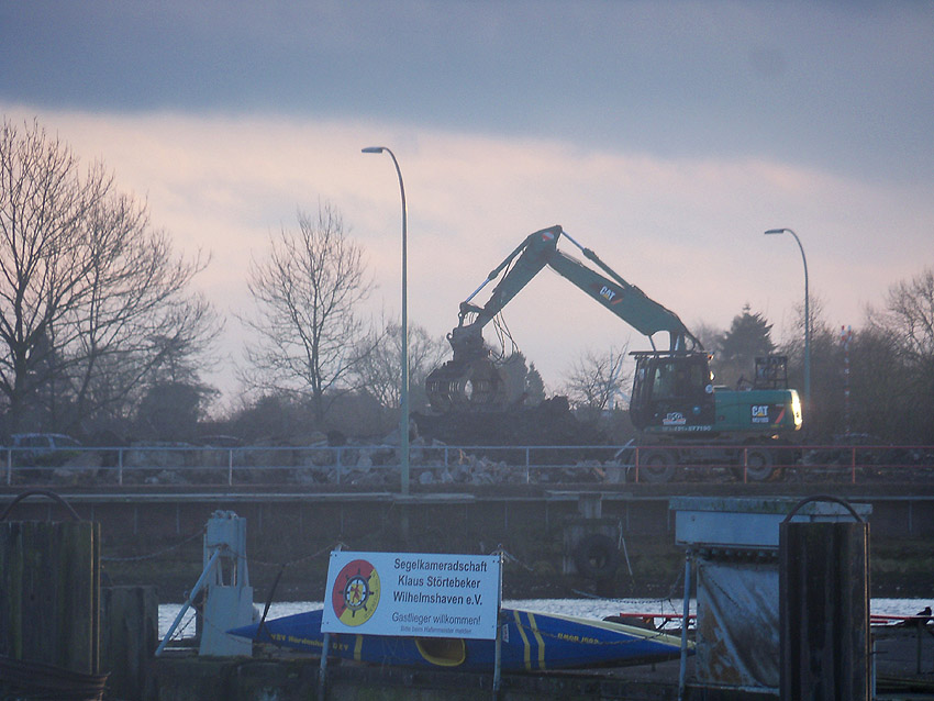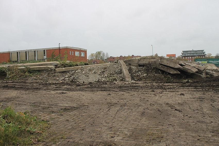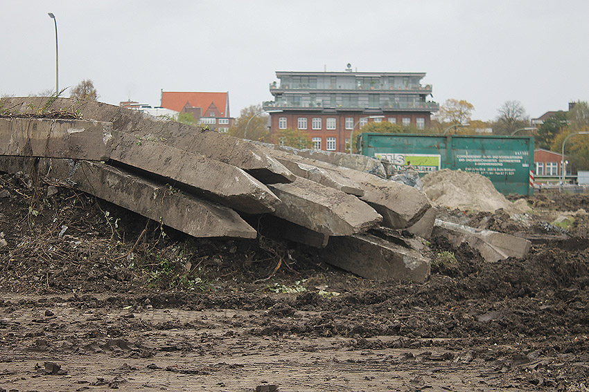 Es tut sich was. Die Stahlbetonfertigträger auf der Bunkerdecke wurden durch einen Bagger verschoben. Der Abrissbeginn dürfte näher rücken.