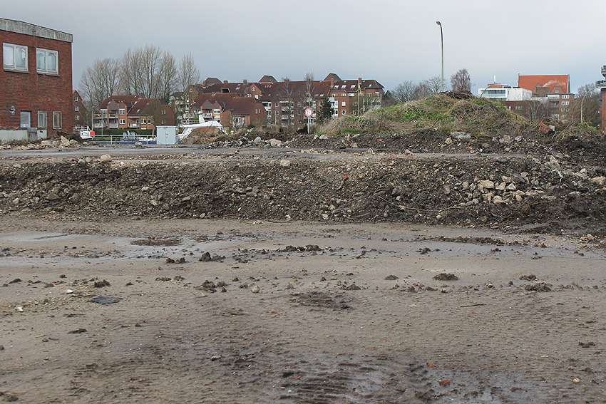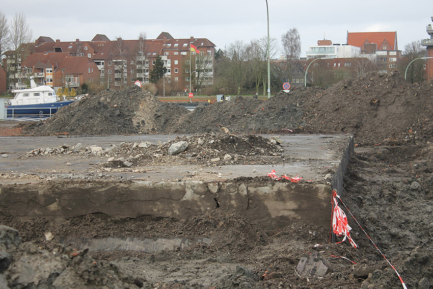 Nachtrag 14. Februar 2018 zum Objekt 2: Das westliche beider "Quadrate" bestand aus zwei nebeneinander gesetzten massiven 3,50 Meter tiefen Betonquadern (unbewehrt). Der Bereich wurde am 7., 8. und 9. Februar 2018 abgebrochen. Eventuell handelte es sich dabei um eine Art Fundament für einen Lastenkran. Vielleicht sogar um eine Art Schwerbelastungs-Testkörper?