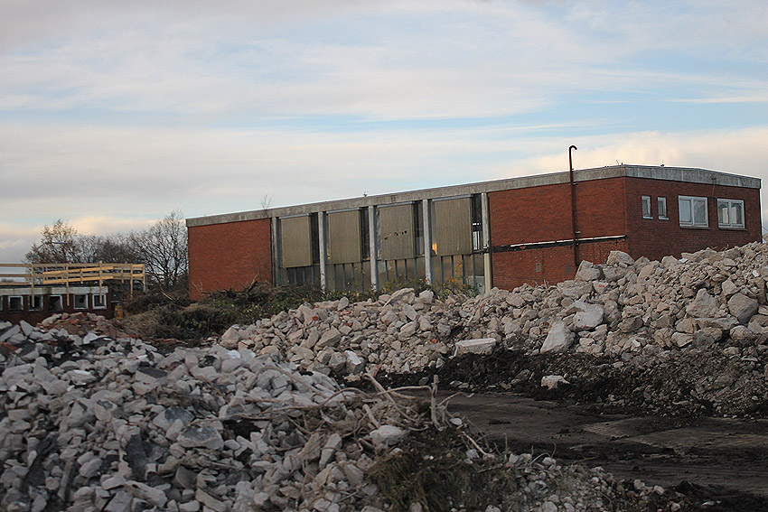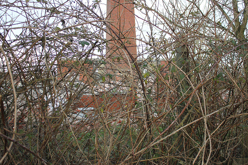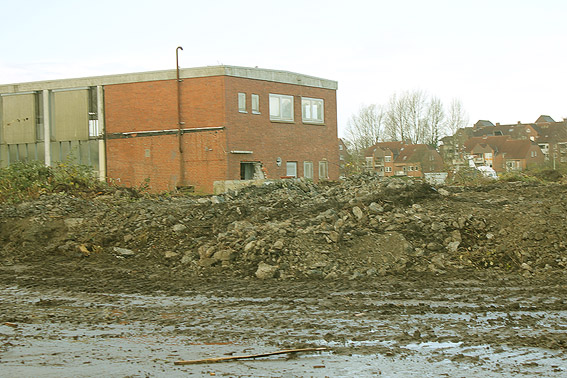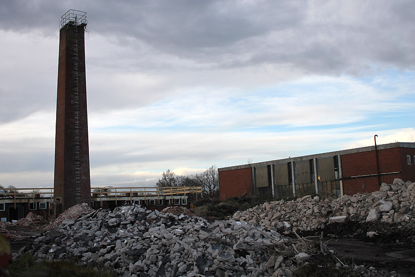 Das am Tiefbunker anliegende Heizwerk-Gebäude wurde bis auf den Schornstein abgerissen. Die Gebäudetrümmer lagern nun zunächst auf der Bunkerdecke.