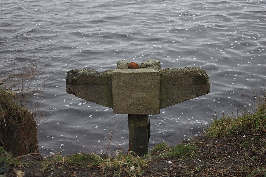 Nachtrag 12.02.18: Das "winkelförmige Massivbetonteil" hat sich nun als zwei nebeneinander liegende betonierte Tanks aus Nachkriegszeiten (BW) herausgestellt. Diese befanden sich ursprünglich unter Erdgleiche. Die beiden seitlich erkennbaren Öffnungen stellen Aufnahmen für Pumpleitungen / Abpumpen / Auffüllen eben dieser Boxen dar.