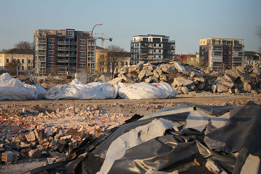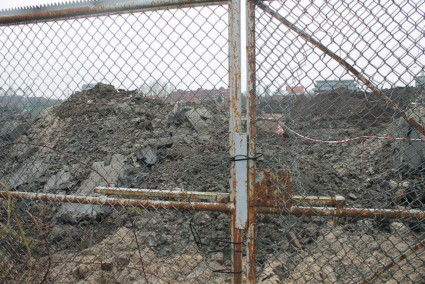 Alles ist abgerissen bis auf den Tiefbunker. Gewaltige Betontrümmer der Nachkriegsbauten-Fundamente türmen sich auf dem Gelände.