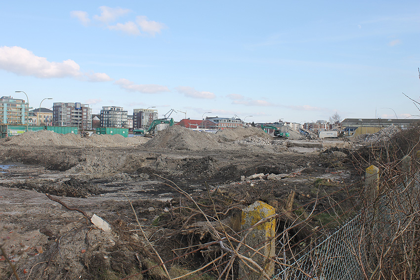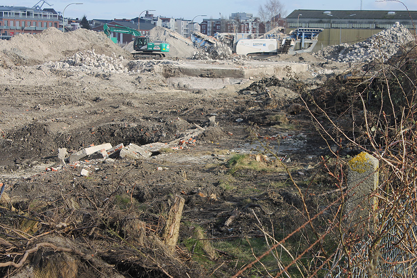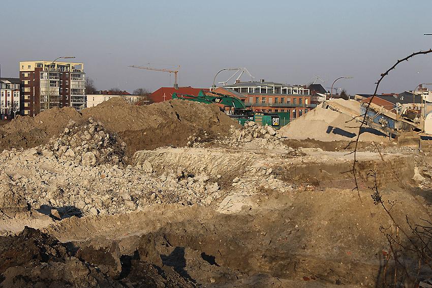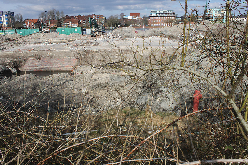 Die Sohlplatte des Tiefbunkers wird weiter abgebrochen. Hinweis: Die vermuteten Kranaufnahmen aus Stahlbeton, welche sich östlich des Bunkers befanden, wurden bereits vor einigen Wochen entfernt. Die Reste der Nordwestwand des Bunkers mit dem letzten "Rauchen verboten"-Schriftzug sind vor knapp zwei Wochen zerkleinert worden.