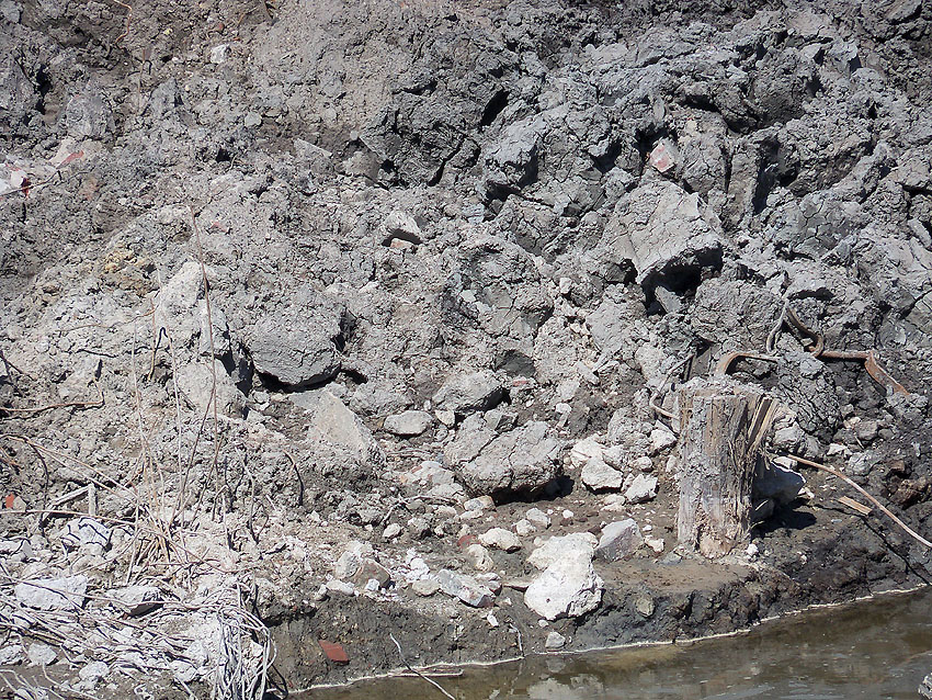 Wider Erwarten sind bis dato doch noch große Teile der Bodenplatte des Tiefbunkers erhalten geblieben. Nachdem das Grubenwasser nun abgepumpt wurde, ist die Platte freigelegt worden. Deren Abbruch ist in Arbeit.