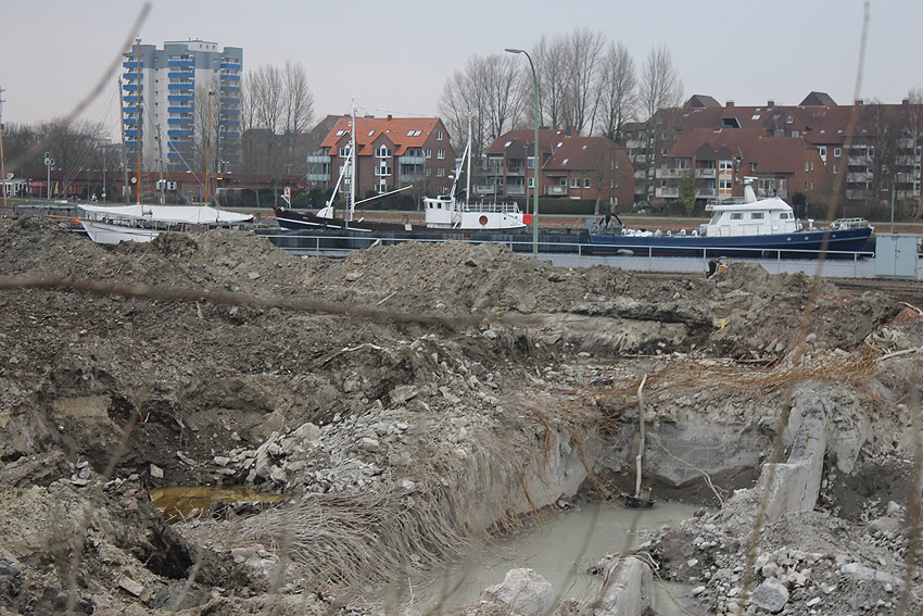 Die Bodenplatte des Tiefbunkers ist großteilig zerstört und damit nun Vergangenheit. Der Sohlbereich des Bunkers ist mittlerweile nicht unerheblich mit Grund- und Hafenwasser vollgelaufen.