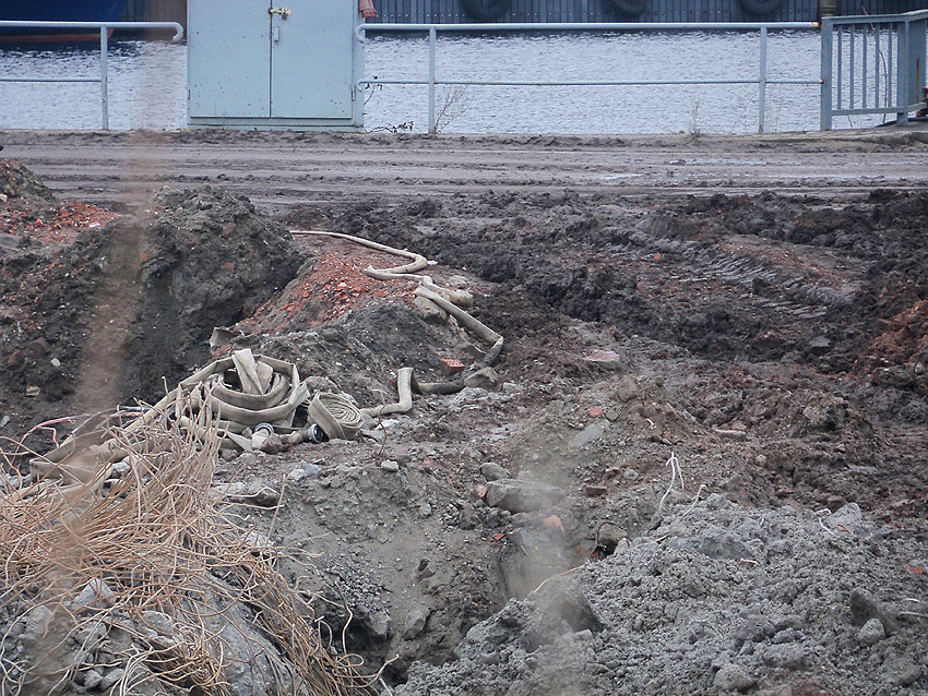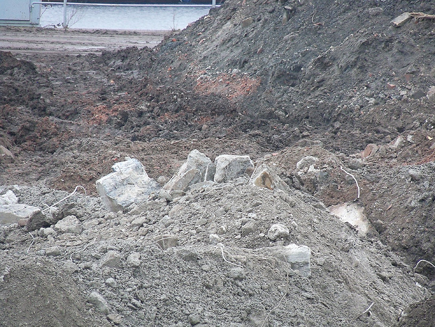 Im Mittelbereich der Wiesbadenbrücke wurde noch einmal "ein Loch gegraben". Hier traten wieder massive Beton- und Mauerwerksteile ans Tageslicht. Es dürfte sich dabei um Reste der Fernwärmeleitungsanlage aus Nachkriegszeiten handeln: